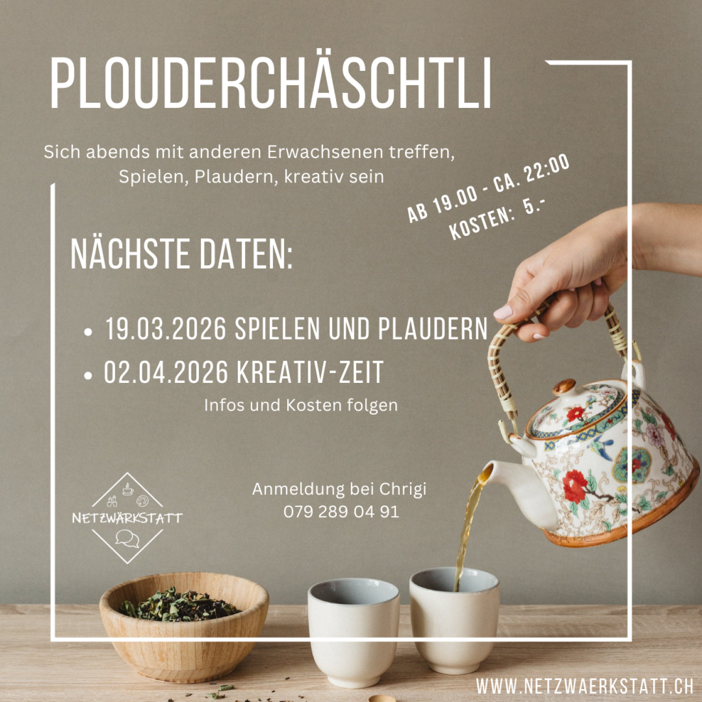 Die Netzwärkstatt ist ein Ort für Begegegnungen und Angebote aller Art und für jedes Alter. Von der Krabbelgruppe bis zum Aquarell Kurs hat alles Platz. Ein wandelbares Netzwerk für alle, die Freude am gegenseitigen Austausch, dem gemeinsamen Lernen und Werken haben.
